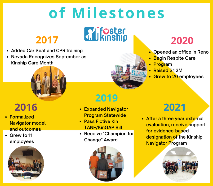 Currently, Foster Kinship has grown to 24 employees with offices in both Clark and Washoe County. We have added even more resources like our Respite Care Program, and our Navigator Program, the first of its kind in Nevada, after an external evaluation has received support for an evidence-based designation.