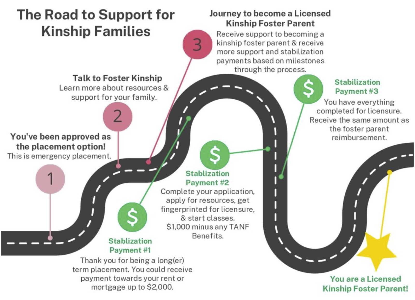 Foster Kinship manages the first steps to getting licensed, and you’ll need to complete some important steps with us before you can complete licensing. There are three important milestones you will reach in the process, each with financial support attached!
