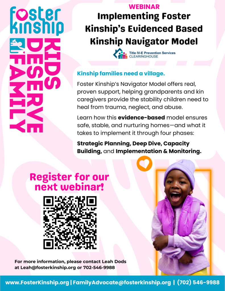 Foster Kinship's Navigator Model closes the gap experienced by kinship families by providing evidence-based programming to strengthen caregivers' capacity to provide safe, stable, and nurturing homes for vulnerable children. The model is proven to provide the stability grandparents and other kin caregivers need to help their children overcome trauma, neglect, and abuse.