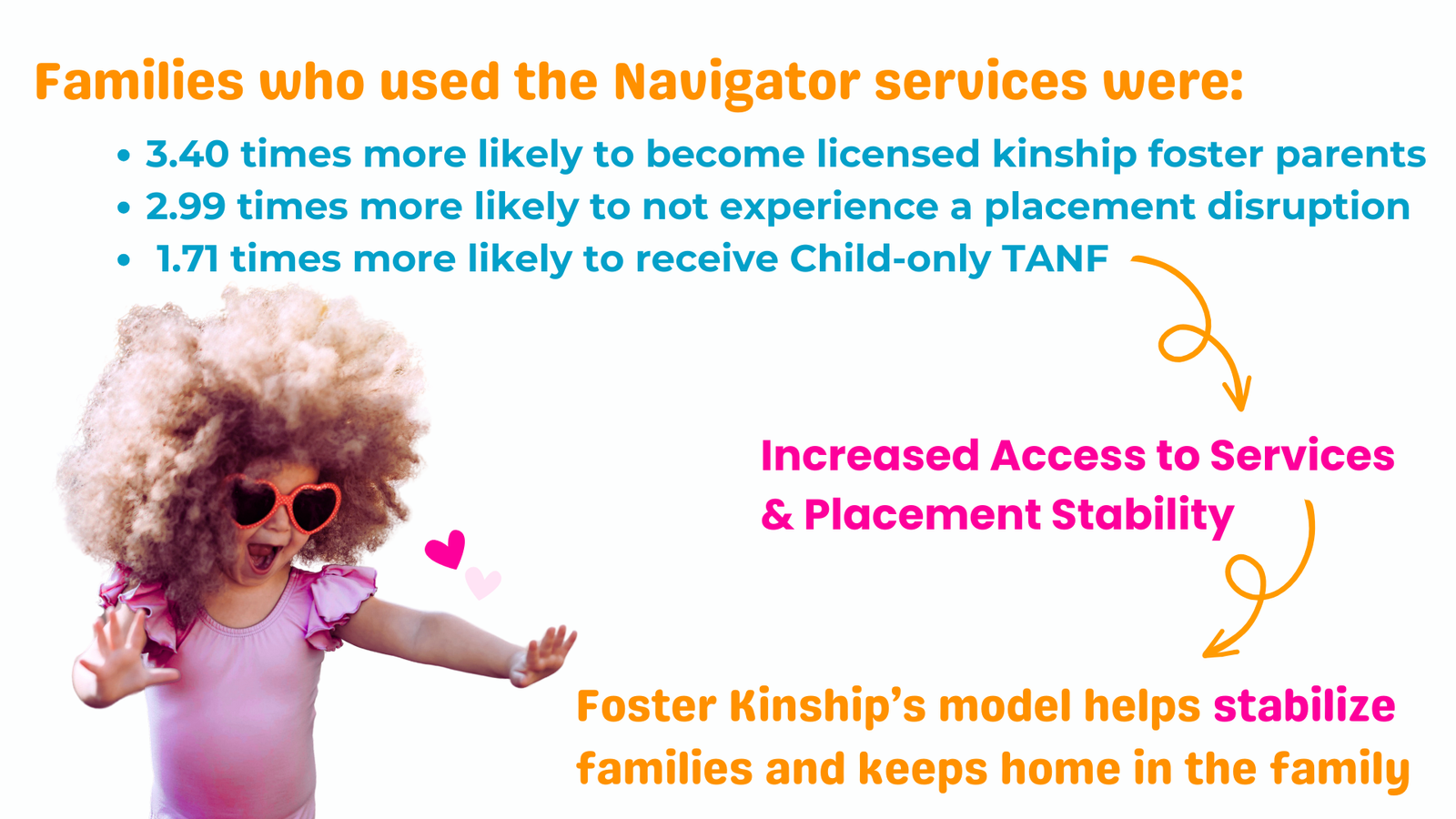 Providing these support services enables families to achieve the critical goals linked with child well-being such as adequate financial support and legal capacity. By increasing family stability in those four areas, the Kinship Navigator Model increases the safety, stability, and nurturing capacity of the kinship home.