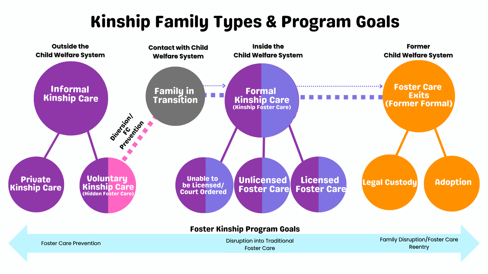 Foster Kinship's model is designed to serve any type of kinship caregiver (defined as both relatives and fictive kin) raising children in nonparental care (neither parent resides in the home) in a defined jurisdiction: 1. Formal/Inside Families, 2. Informal/Outside Families, 3. Kinship Families in Transition, and 4. Families who have adopted.